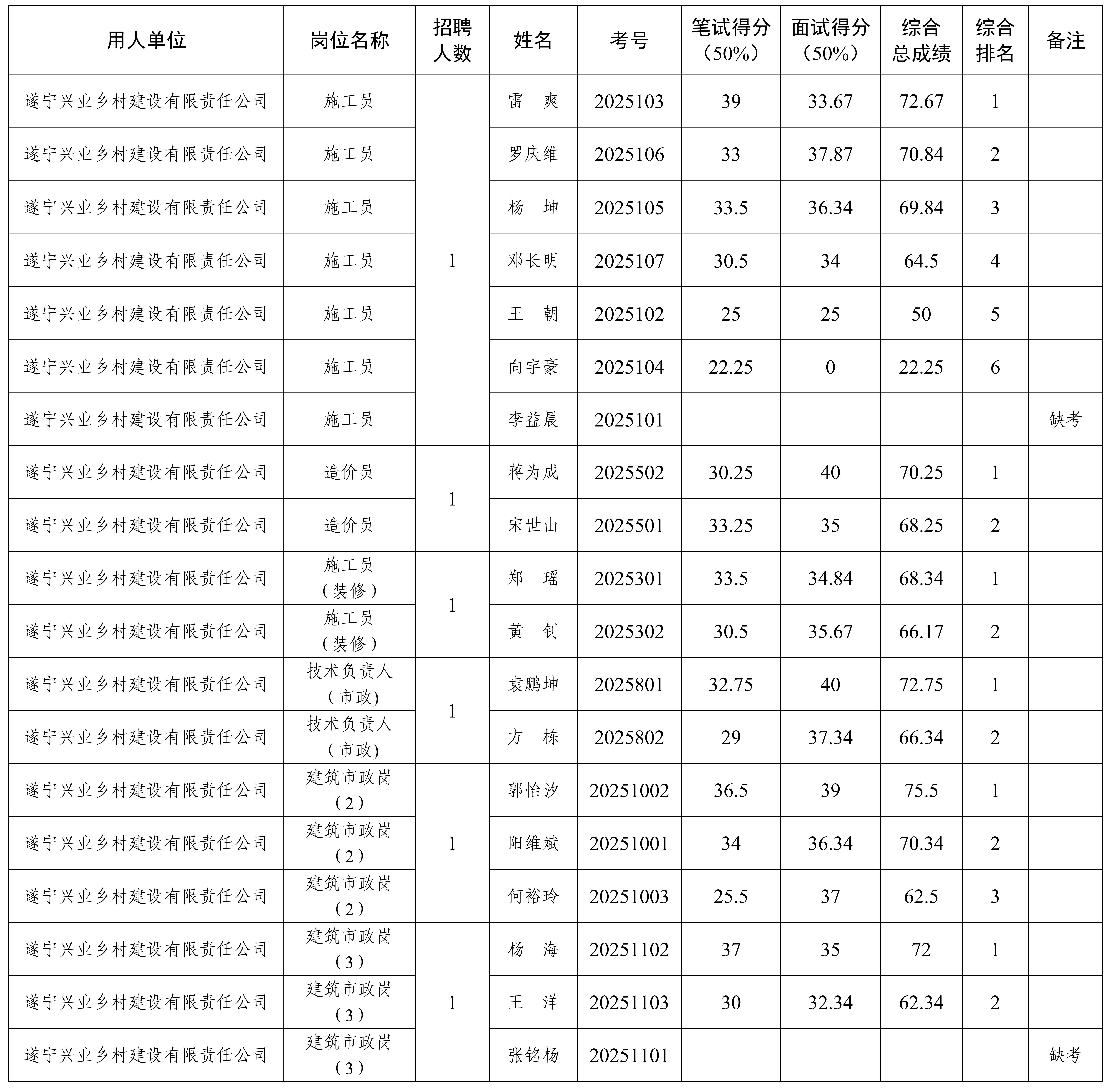 遂寧興業(yè)投資集團(tuán)有限公司 2025年興業(yè)鄉(xiāng)建公司項目合同制用工綜合總成績排名公示